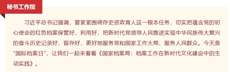 ?檔案是人類(lèi)活動(dòng)的真實(shí)記錄,是文化傳承的重要載體;檔案工作存史資政育人,是文化建設(shè)的重要力量。國(guó)家檔案局深入學(xué)習(xí)貫徹習(xí)近平文化思想,更新理念、創(chuàng)新方法,通過(guò)系統(tǒng)謀劃和組織協(xié)調(diào),指導(dǎo)帶動(dòng)各級(jí)檔案部門(mén)以多種形式挖掘開(kāi)發(fā)檔案資源,主動(dòng)融入和服務(wù)新時(shí)代文化發(fā)展繁榮大格局,積極推動(dòng)文化強(qiáng)國(guó)建設(shè)。